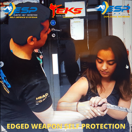 The second section of the corporate class recaped over some of the edged weapon personal security actually from Eclectic Self Protection, with a questions and answers from the students. In addition, we looked at personal and natural defences to the abdomen, both sides of the throat (from front), and to the centre of the back, using Eclectic Free Fighting principles from actual syllabus. In all of these cases compliance was stressed, and the protocals of dialogue, deception and surprise 'energizing' off basic fences and arm sprays. ESP Coach also gave some breif details of hight threat and emergency situations with key aspects of personal security, personal safety and damage limitation.